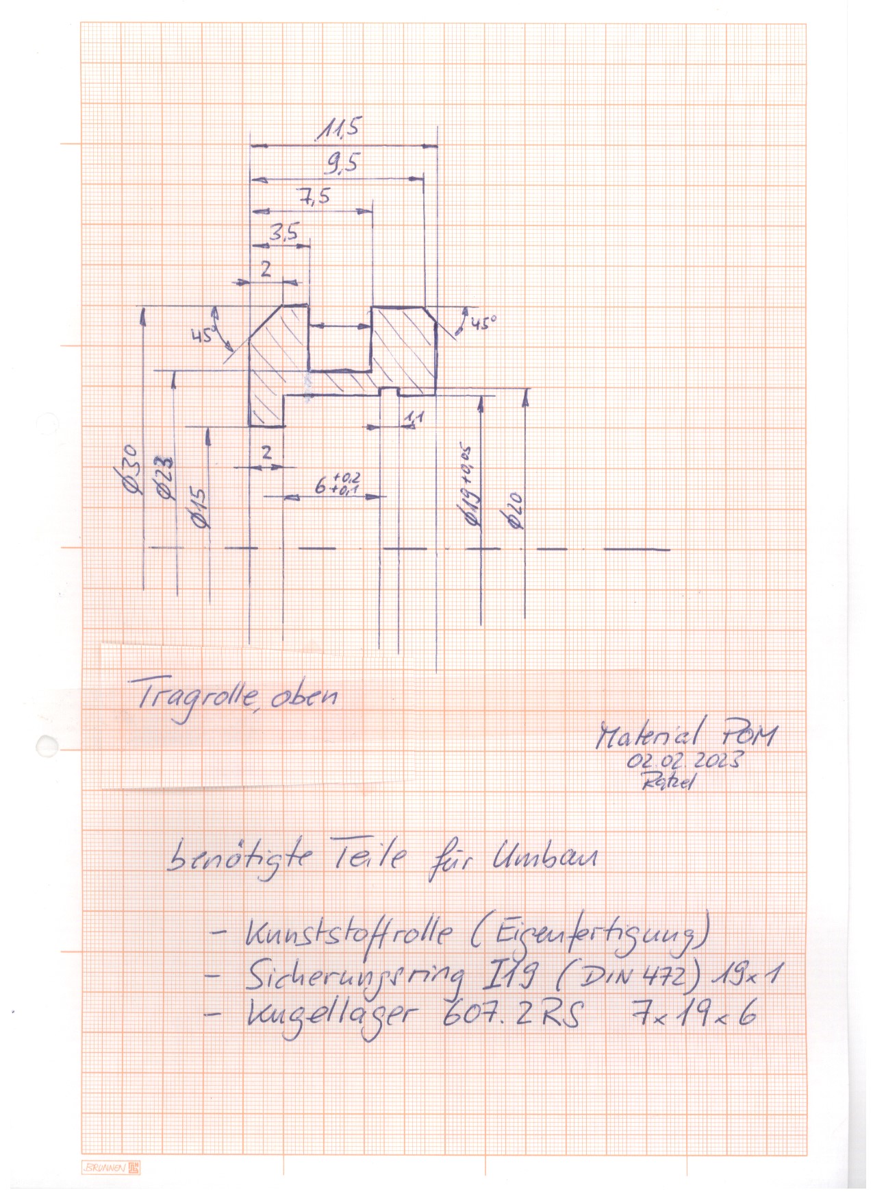 1x Kunststoffrolle nach Zeichnung „Tragrolle unten“ (Eigenfertigung)/ Material POM