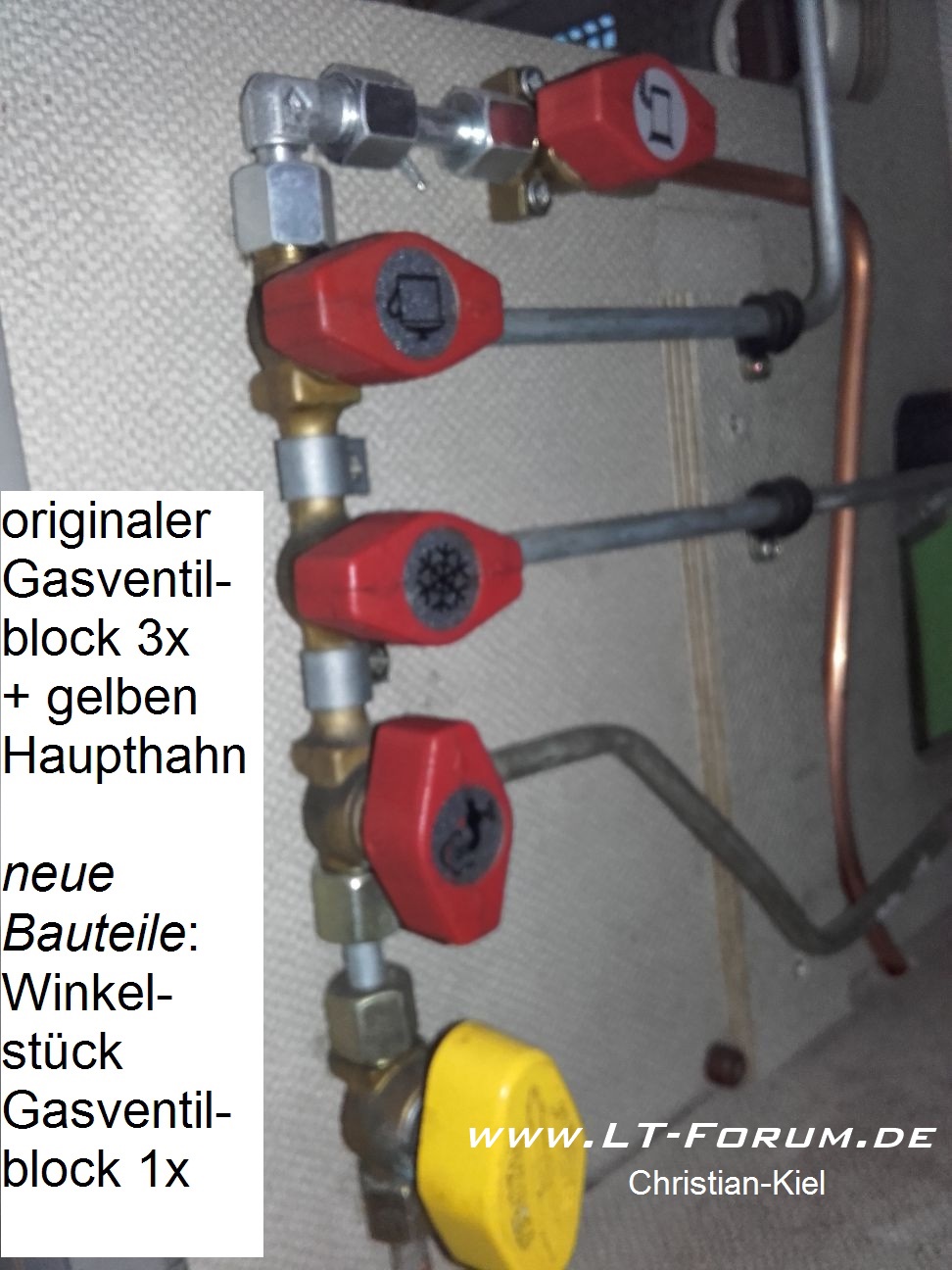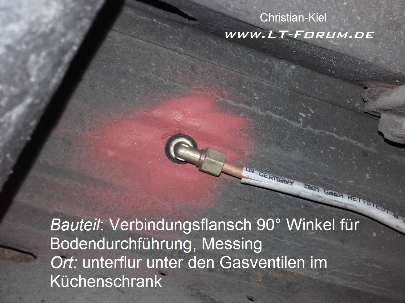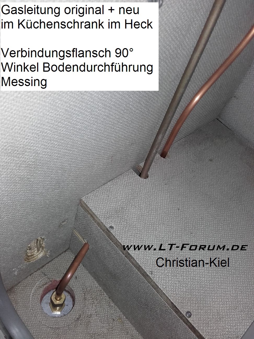 Die Gasleitung für die Gasheizung, startet am Verteilerblock, im hinteren Küchenschrank und wurde in einem Stück unter dem Fahrzeugboden verlegt. Ein Boden-Durchlass-Stück ist im Küchenbereich (Siehe Bild) eingebaut. Die Rohrdurchführung durch den Boden nahe der Gasheizung, wurde ohne zusätzliches Boden-Durchlass-Stück montiert und die Gasleitung direkt mit der Heizung verschraubt.Die Gasleitung für die Heizung ist somit sehr lang (~5m). Die Erweiterung des Verteilerblockes um ein Ventil erweist sich als einfach zu installieren und ist bedienerfreundlich. Auch das neue Ventil ist somit nicht der Witterung ausgesetzt.