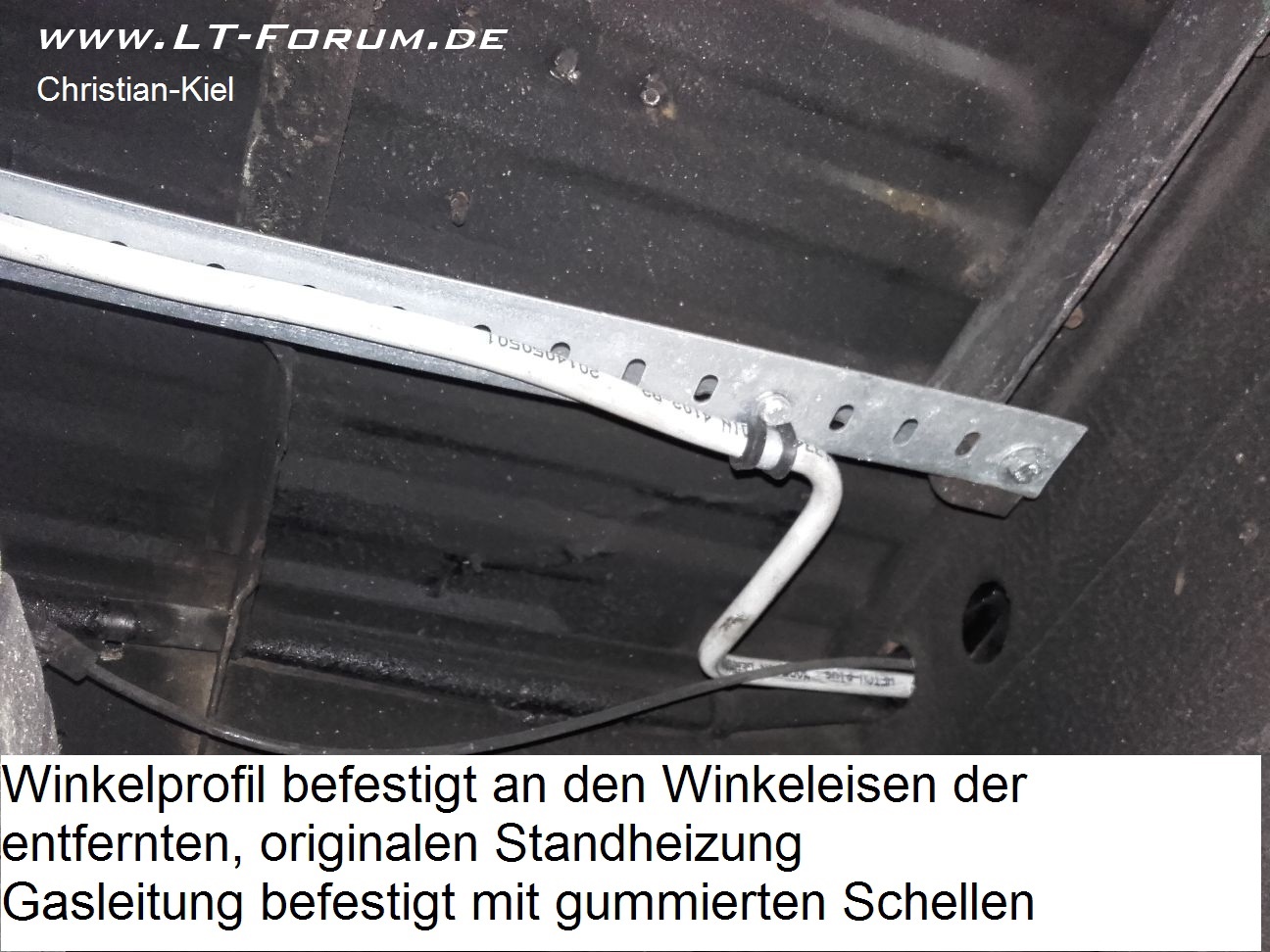Die Einbauanleitung der Gasstandheizung sollte man gelesen haben, sowie Literatur für den Einbau von Gasanlagen für den Fahrzeugbereich. Materialwahl der Gasleitung und Abstände der Schellen zueinander, Abstand zu heißen Oberflächen und elektrischen Leitungen klären sich somit.