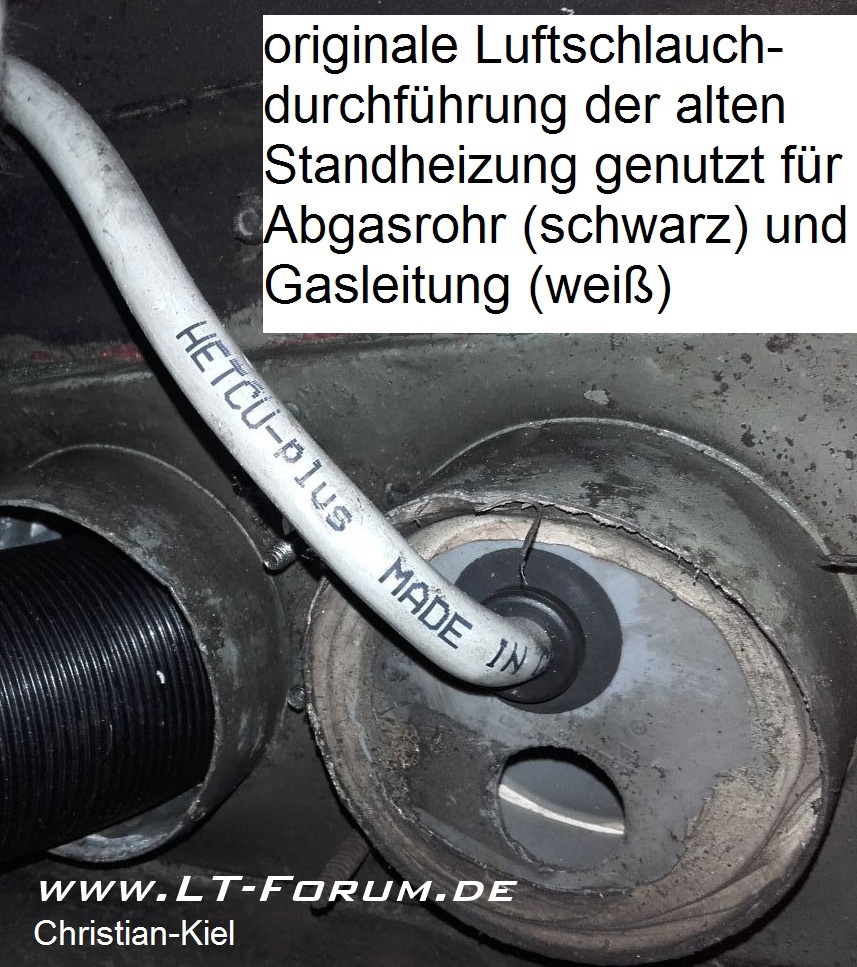 Die Heizung ist so montiert, dass das Abgasrohr sich direkt über dem Loch im Fahrzeugboden befindet. Das Loch wurde ursprünglich für den Warmluftschlauch genutzt. Ich habe in dieses Loch oben und unten ein Rohr-Endstück eingeklebt, welches im Sanitär-Bedarf erhältlich ist. Somit ist das zu große Loch gut geschlossen und es ist einfach, ein neues Loch in den Kunststoff zu bohren, in passender Größe. Durch das zweite Loch (welches auch ursprünglich für einen Luftschlauch der Standheizung genutzt wurde) verläuft die Gasleitung. Die Löcher haben einen Gummischutz bekommen, der aufscheuern verhindern soll.