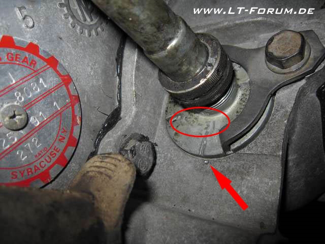 Bild 7: Tachoantrieb, Zähnezahlbereich (Ellipse) und Marke am Gehäuse (Pfeil)