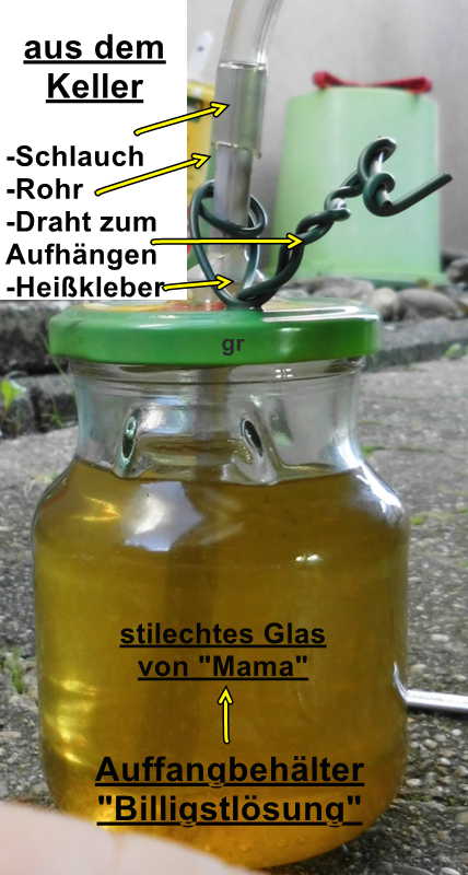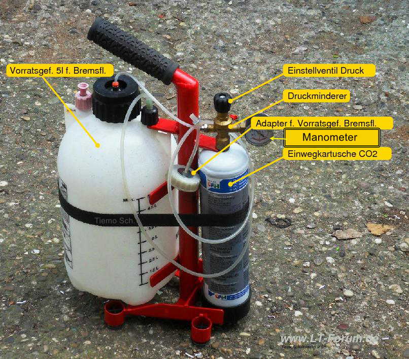 Dazu braucht er einen Auffangbehälter, ca. 0,5 Liter, mit Rohr und Verbindungsschlauch für die am Ventil austretende Bremsflüssigkeit.