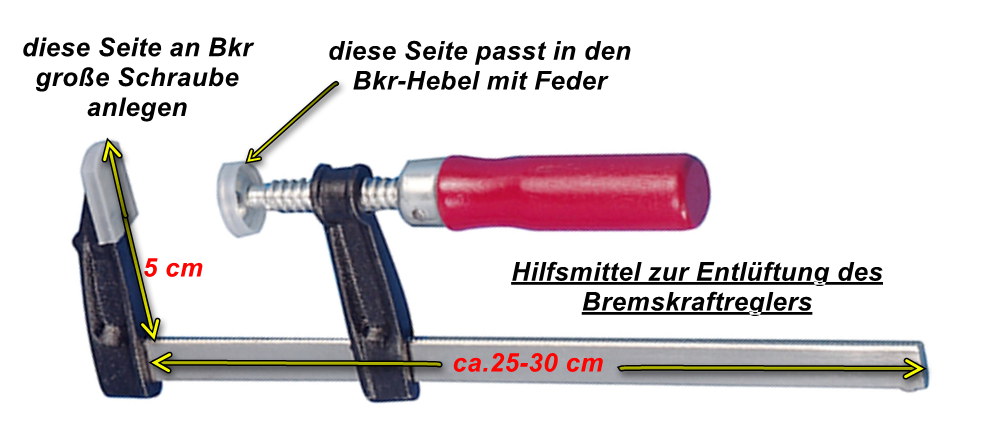 Wenn der LT derart aufgebockt ist, daß die Hinterachse komplett entlastet ist, sollte man den Hebel des BKR mit Hilfe eines Spanngurtes in Federrichtung spannen oder eine billige Schraubzwinge dazu verwenden; ca. 2,50€