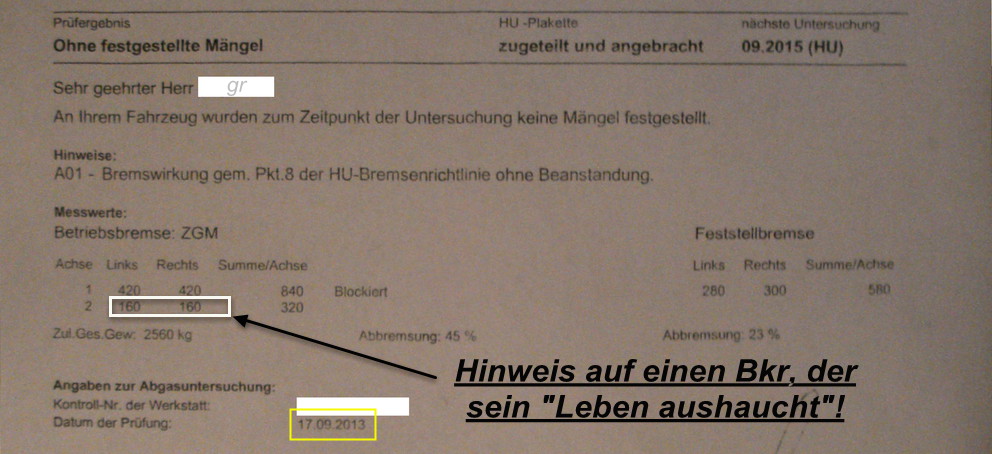 In den neueren Prüfunterlagen steht für die Prüfer extra noch mal drin, dass die Bremswerte bei Fahrzeugen mit BKR in Verbindung mit dem Ladezustand zu sehen sind und ggf. eine Ladung auf die Hinterachse aufgebracht werden muss, um korrekte Ergebnisse zu erzielen. Weiß aber anscheinend dennoch nicht jeder… (Auszug aus Forumsbeitrag von Tiemo 08.11.2016)