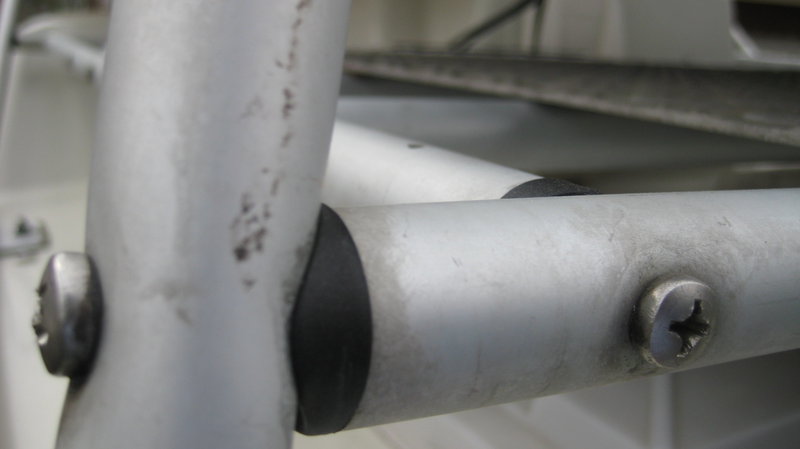 Da bei meinem Florida eine Schraube am Dachträger gebrochen war, musste ich einen Teil des Trägers abbauen, um den Rest der Schraube rauszudrehen. Dabei fiel mir auf, dass die Kunststoff-Distanzstücke zwischen den Alu-Rohren schon sehr verwittert und zerbröselt waren.