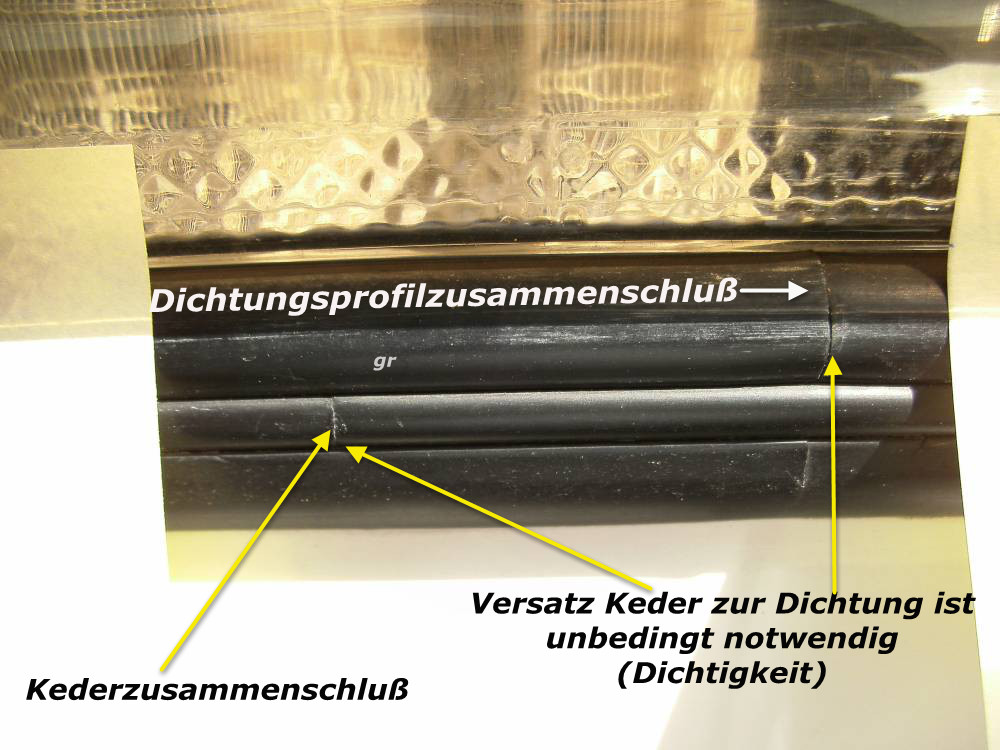 Jetzt wird der Keder eingebracht. Anfang ist ca. 15 mm NACH dem Zusammenschluss der Profildichtung