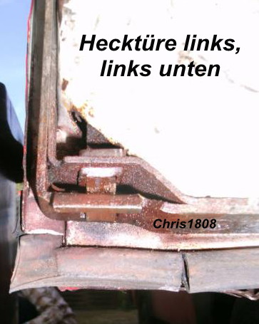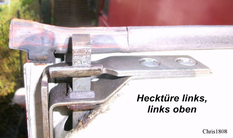 -die absolut verbrauchten, porösen Heckfensterdichtgummis, die dadurch undicht sind und erheblich Feuchtigkeit in das Türinnere zulassen. Folge, feuchtes Dämmmaterial und Rostfraß besonders an den Türenunterkanten.