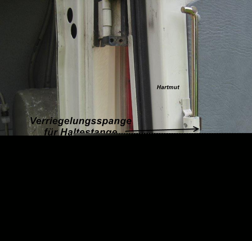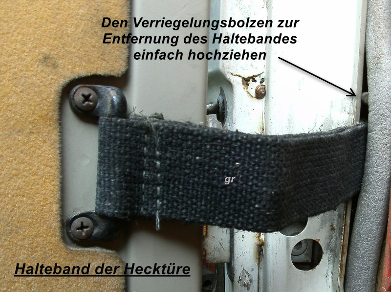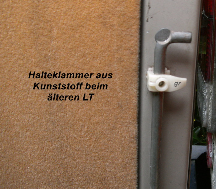 Die Hecktüren sind duch Haltebänder und Haltestangen davor gesichert, damit die sich die Türen nicht unkontrolliert über die Gesamtbreite des LT öffnen. Entfernt man die Haltebänder, lassen sie sich um ca. 220 Grad öffnen.. Das ist unter normalen Umständen nicht erwünscht(Unfallgefahr beim Aus-/Entladen im fließenden Verkehr).
