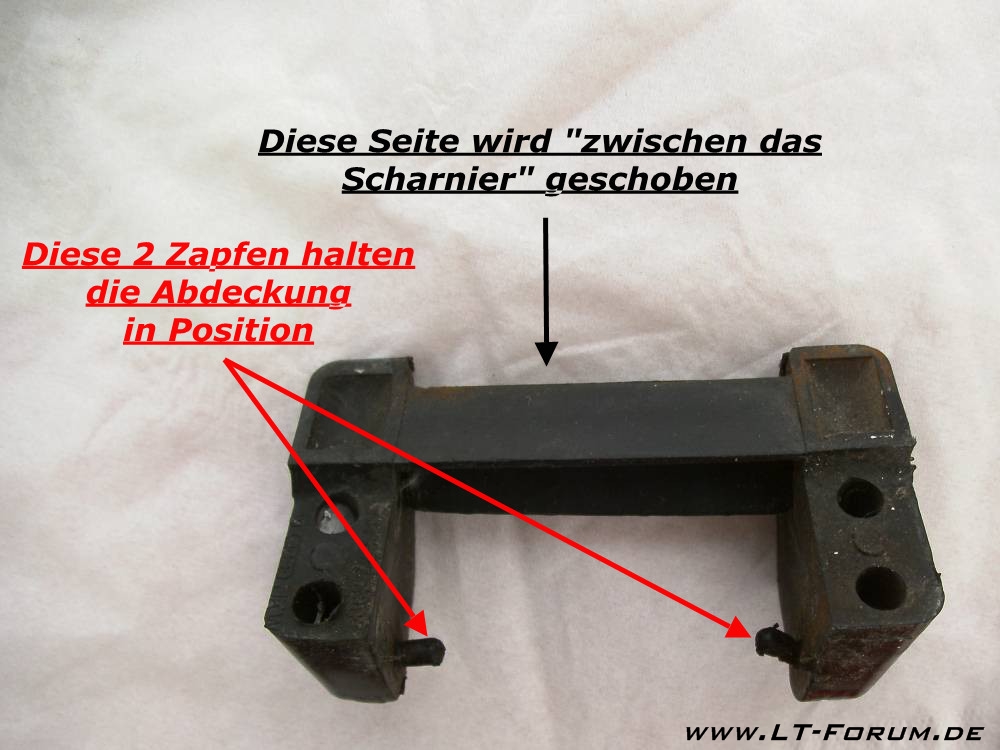 Um die Scharniere sind Kunststoffabdeckungen, die mit kleinen Zapfen oben und unten in die Spannhülsen der Scharniere gehen. Beim Ausbau darauf achten, dass die Kunststoffzapfen nicht abgeschert werden. Sie halten die Abdeckung in der erforderlichen Position.