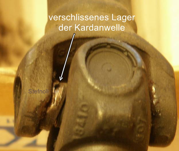 Der Nachteil für den LT-Besitzer ist, dass nach Ausschlagen, bereits eines der 4 Lager, das Kreuzgelenk ersetzt werden muss; aber, weil der Nut für die Spange fehlt, geht das nur in einer der wenigen Fachbetriebe, wegen des wahnsinnig teuren Prägewerkzeuges; und die Kardanwelle muss in ihrer Gesamtheit ohnehin ausgewuchtet werden!
