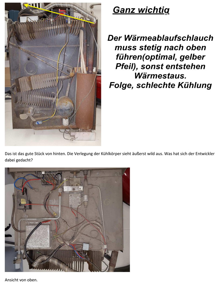 Das ist der Moment, in dem dann die Kälte entsteht. Das Abkühlen bewirkt dann, dass das Gas wieder in die Flüssigform zurück verwandelt wird, um den Vorgang erneut starten zu können. Deshalb die komische Verlegung der Rohre hinter dem Kühli.