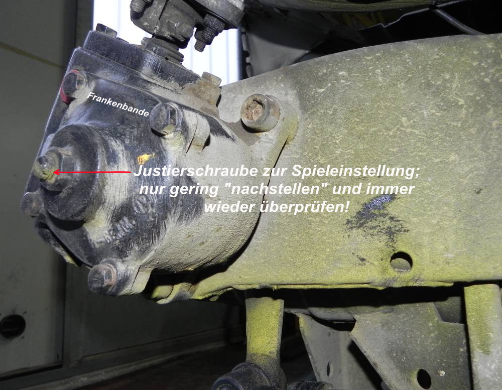 Man kann am Lenkgetriebe das Arbeitsspiel in Geradeausstellung einstellen. Dazu dient die zentrale Schlitzschraube mit der Kontermutter auf dem Bild. Das Spiel in Geradeausstellung muss am abgekoppelten Lenkrollenhebel gerade eben noch spürbar sein. Auf keinen Fall darf das Getriebe in irgendeiner Stellung schwer laufen.