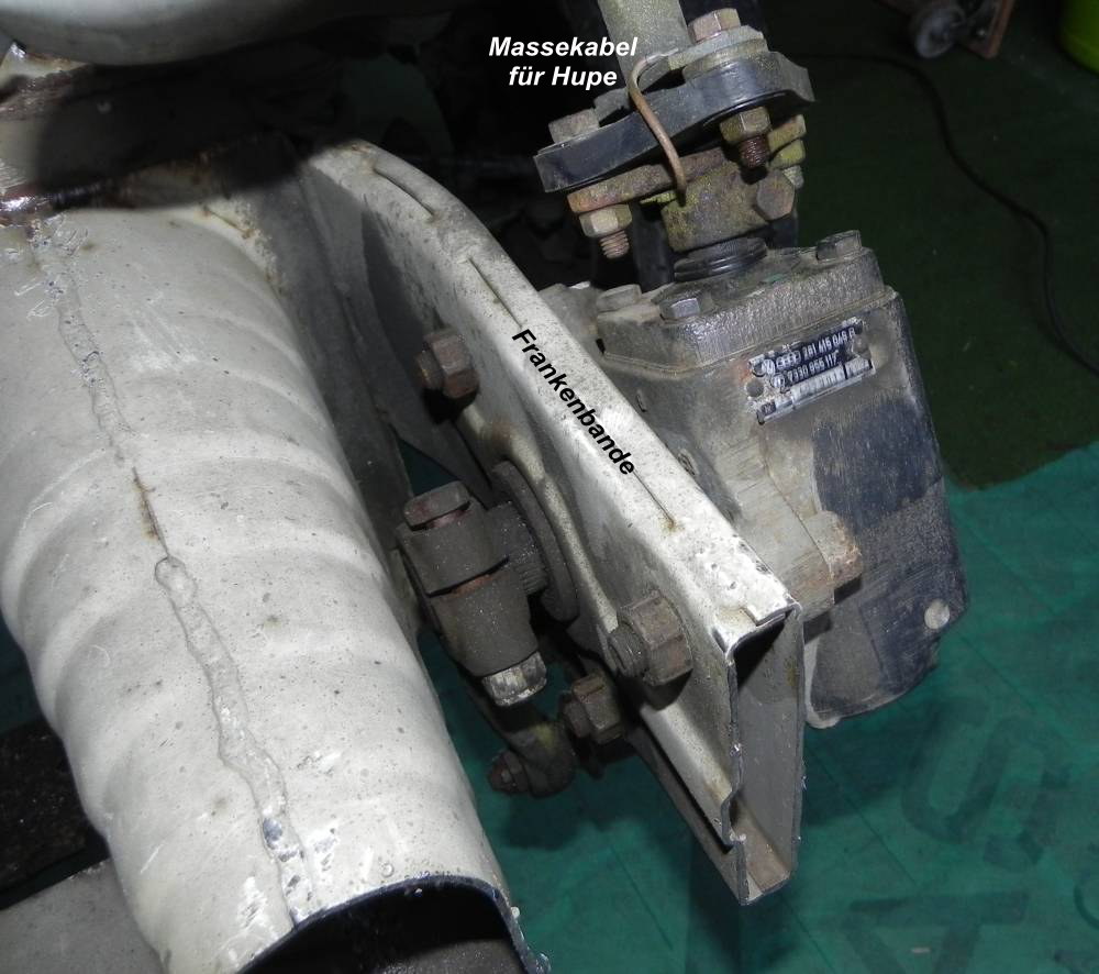 Bei dieser Gelegenheit gleich den Zustand der sogenannten „Hardy-Scheibe„, eines mit Hilfe einer flexiblen Gummischeibe realisierten Kardangelenkes oberhalb des Lenkgetriebes, prüfen (auf dem Beispiel im Foto weiter unten ist ein beginnender Riss zu sehen, das bedeutet Austausch!).