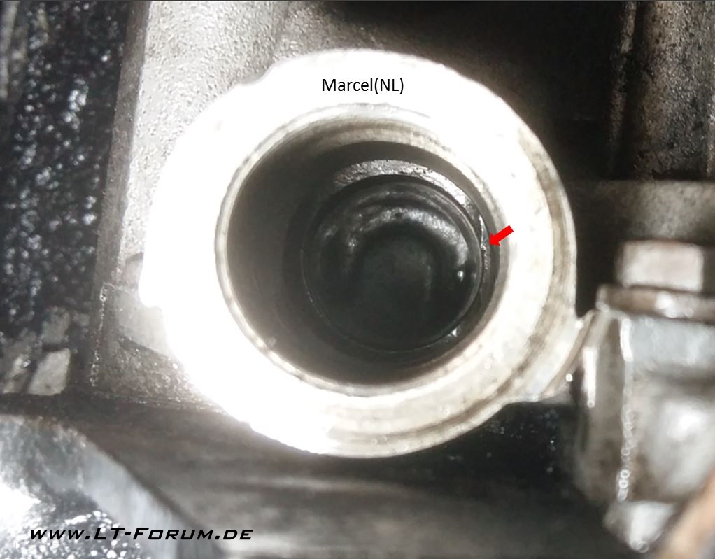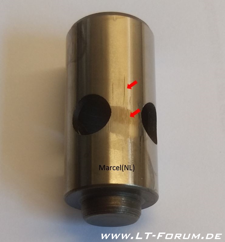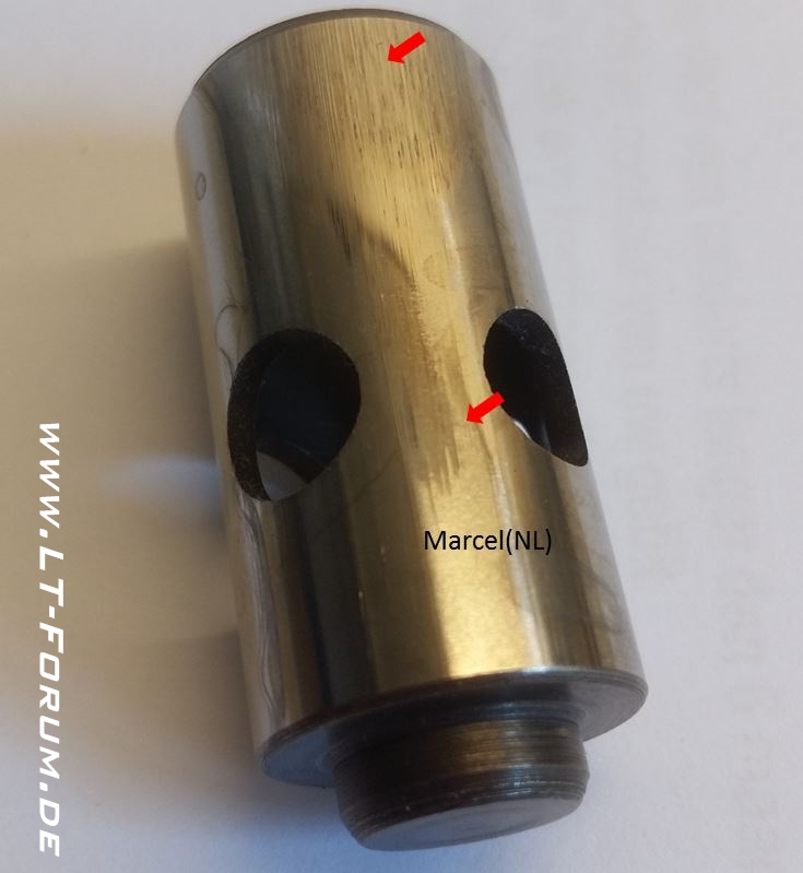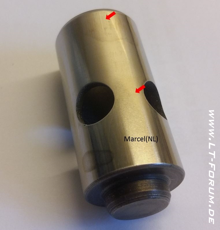 2) Die Löcher sind durch Metallspäne verstopft: das Öl kann nicht ablaufen und der Öldruck wird viel zu hoch. Hierdurch wird der Kolben viel zu tief gedrückt, was zu Beschädigungen am Kolben und der Zylinderwand führen kann („kippen“ des Kolbens).