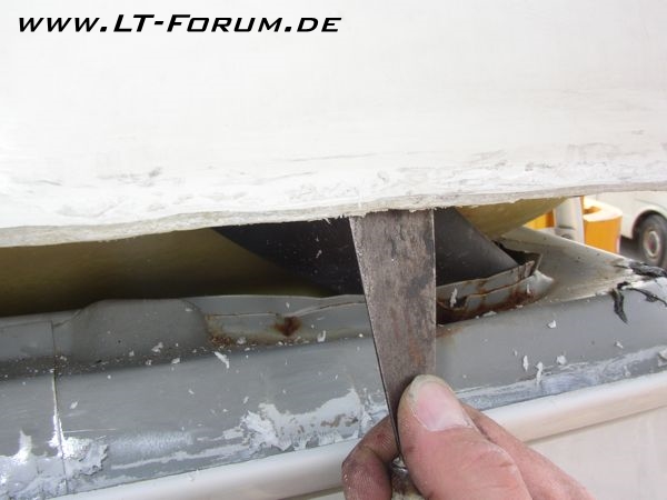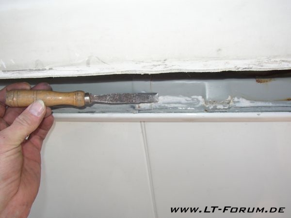 Nachdem die Regenrinne ganz frei von Dichtmasse ist, kann das Dach gelöst werden. Eine der Möglichkeiten ist, nach und nach das Dach rund herum zu lösen.
