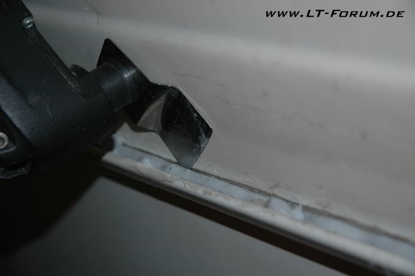 Zuerst muss die Dichtmasse vollständig entfernt werden. Das ideale Werkzeug ist der Fein Multimaster. Die Bilder zeigen wie er am angesetzt werden kann: