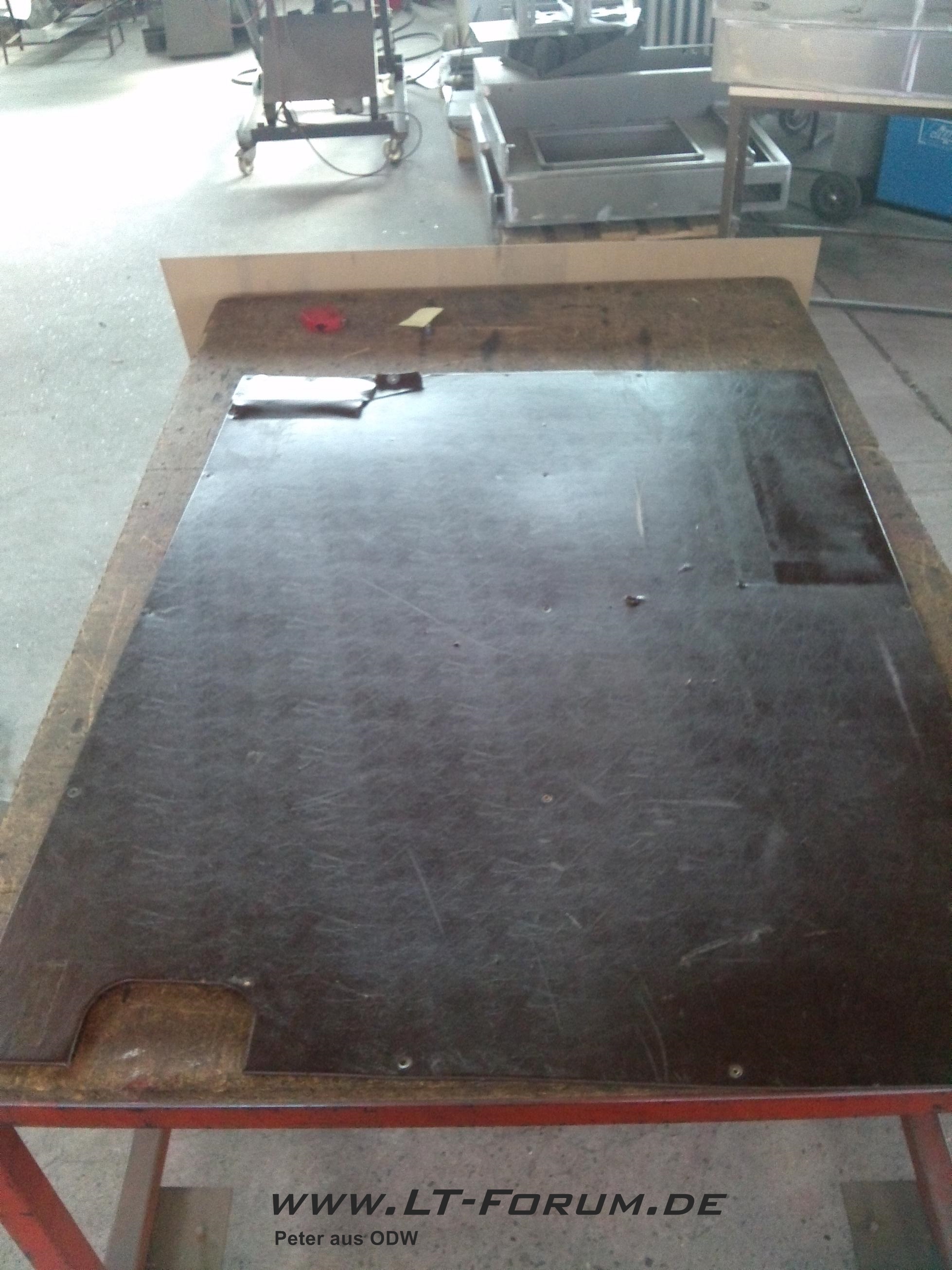 Zunächst vorsichtig das angeklebte Kunstleder entfernen und möglichst darauf achten, dass die Grundplatte weitestgehend unbeschädigt bleibt, diese wird später noch einmal benötigt, um das vorhandene Lochbild zu kopieren/abzubohren.