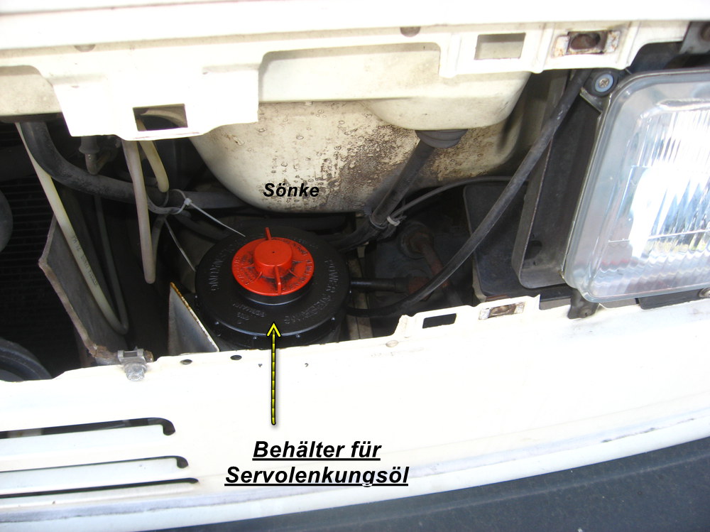 Zum Ablassen des Öls löst man am besten die Hohlschraube an der Servopumpe, an der die Vorlaufleitung vom Ausgleichsbehälter kommend angeschlossen ist. Dann läuft die Leitung und der Ausgleichsbehälter leer. Eine Restmenge Öls verbleibt in der Druckleitung von Servopumpe zum Lenkgetriebe und im Lenkgetriebe selber, sowie in der Rücklaufleitung vom Lenkgetriebe.