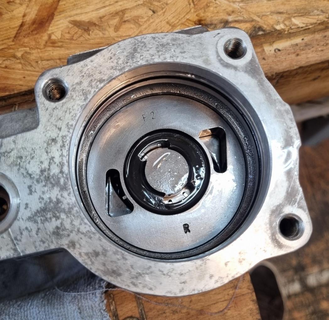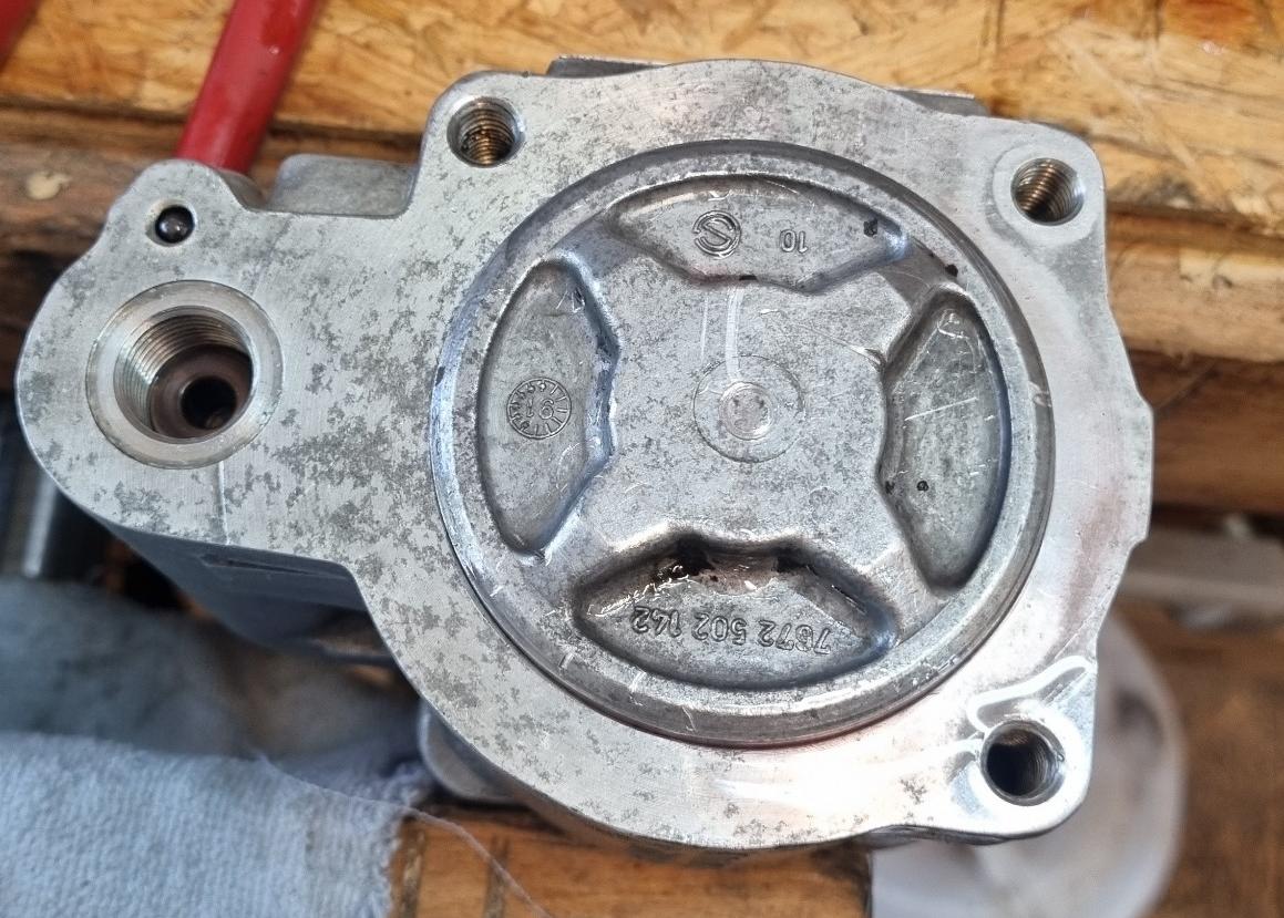 Sonderwerkzeug demontieren und mit dem Schonhammer vorsichtig auf den Pumpendeckel klopfen. Hier kann es sein, dass der Pumpendeckel nicht vollständig aus dem Gehäuse kommt (Dreck, Grate etc.). Es kann helfen, den Deckel vorsichtig mit einem Kupferdorn sternförmig anzuschlagen – so kommt er Stück für Stück weiter aus dem Gehäuse.