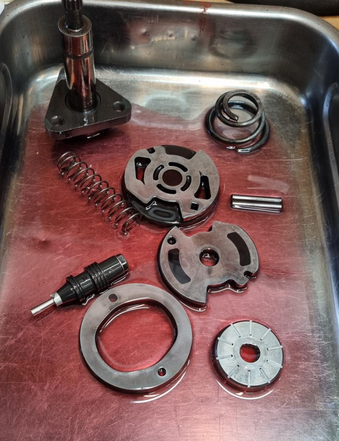 Nun ist die Servopumpe komplett leer und kann gereinigt werden, es bietet sich an, dafür ein Ultraschallgerät zu nutzen – Diesel und Pinsel tut es aber auch.