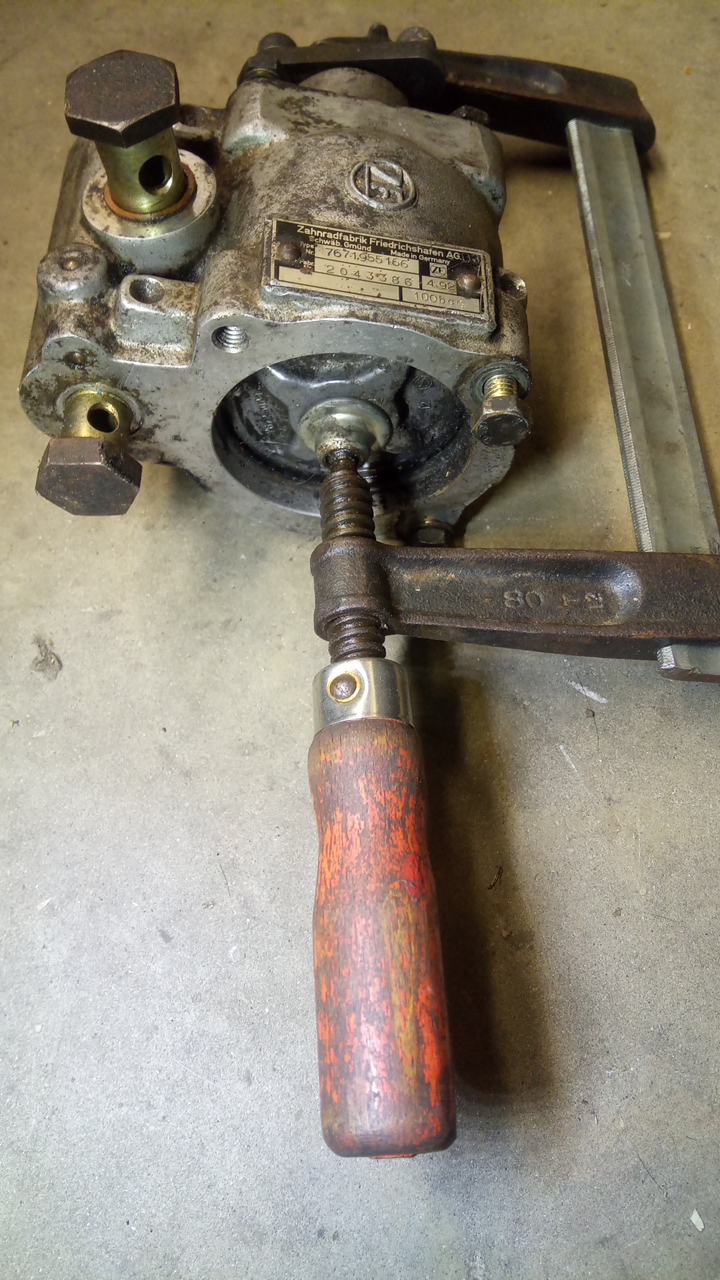 Es wird ein Niederhalter oder eine Schraubzwinge für den rückseitigen Pumpendeckel benötigt, um den Feder-Sicherungsring entfernen zu können.
