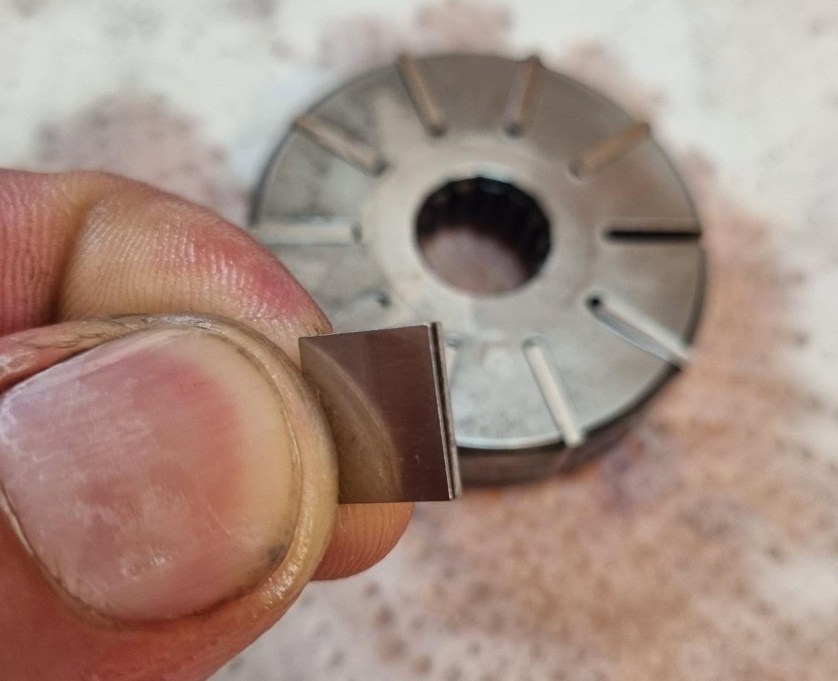 Das Flügelzellenrad und die dazugehörigen 10 Lamellen können nur von oben entnommen werden. Das Flügelzellenrad hat zwei Seiten: Oben hat es einen kleinen Absatz in dem der Sicherungsring sitzt, auf der Rückseite ist die Bohrung angesenkt (siehe Foto).