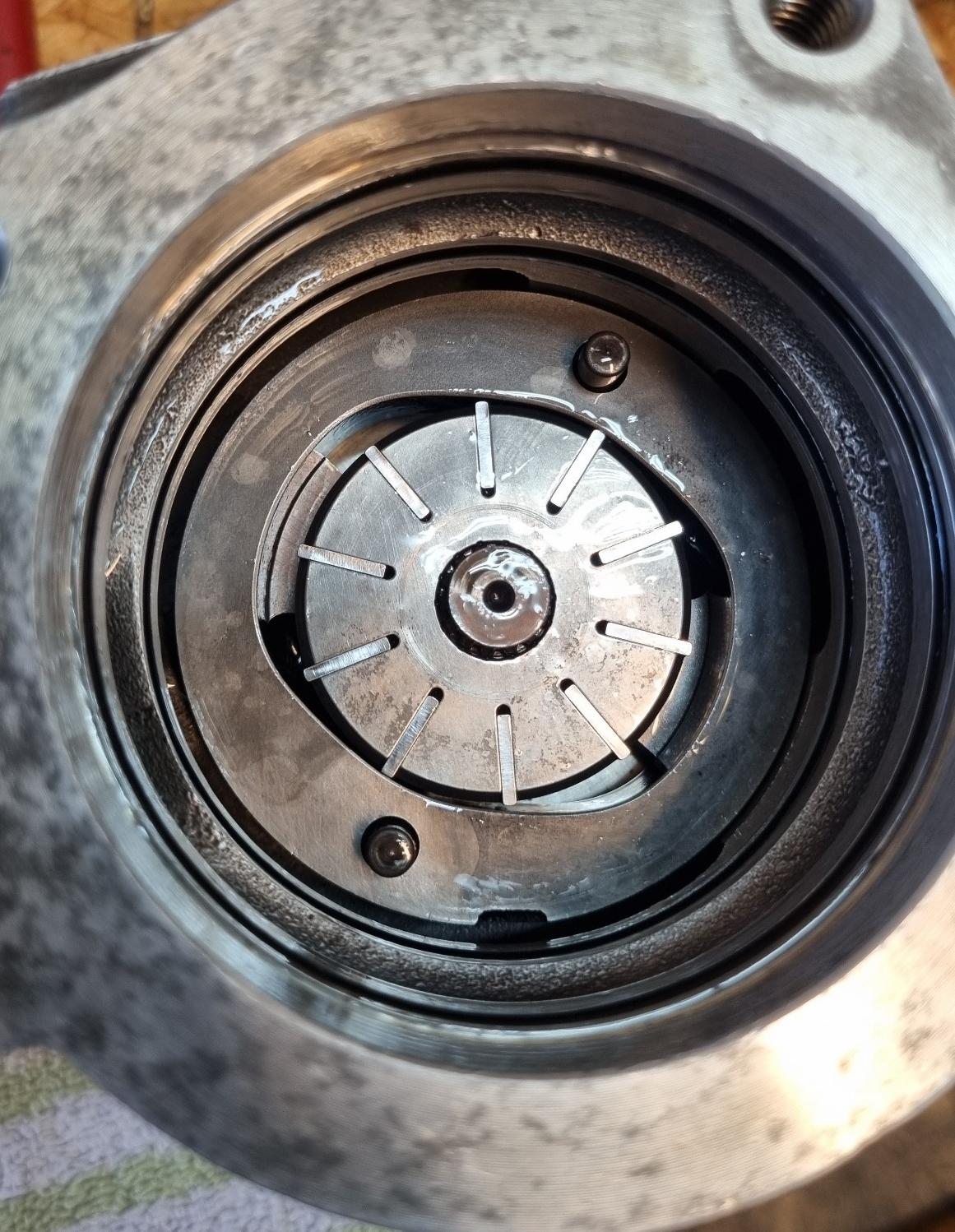 Nun Druckkammerscheibe zur Seite legen, es wird der Blick auf die Zwischenscheibe und das Flügelzellenrad frei.