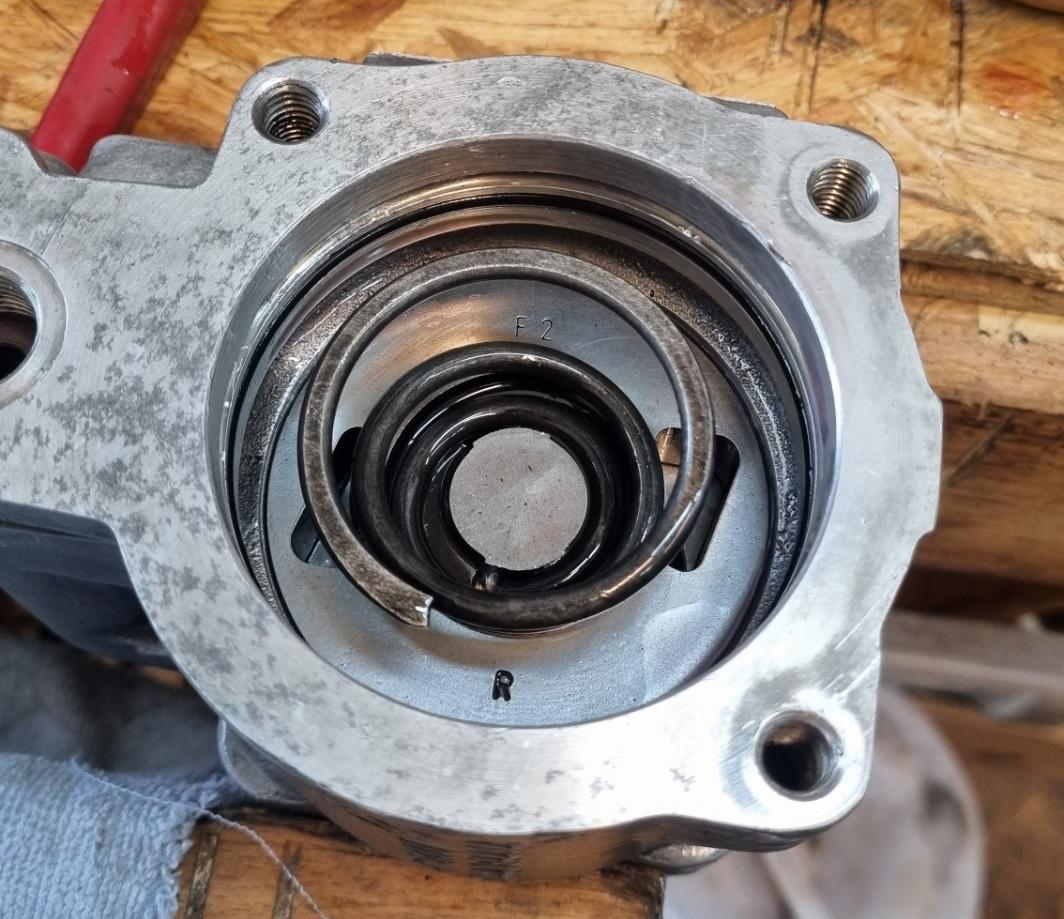 Jetzt hat man Zugang zur Druckkammerscheibe Nr.1 - sie sitzt arretiert mittels der beiden Passstifte sehr passgenau im Gehäuse - hier ist es hilfreich die Pumpe umzudrehen und vorsichtig mit dem Schonhammer auf das Gehäuse zu schlagen.