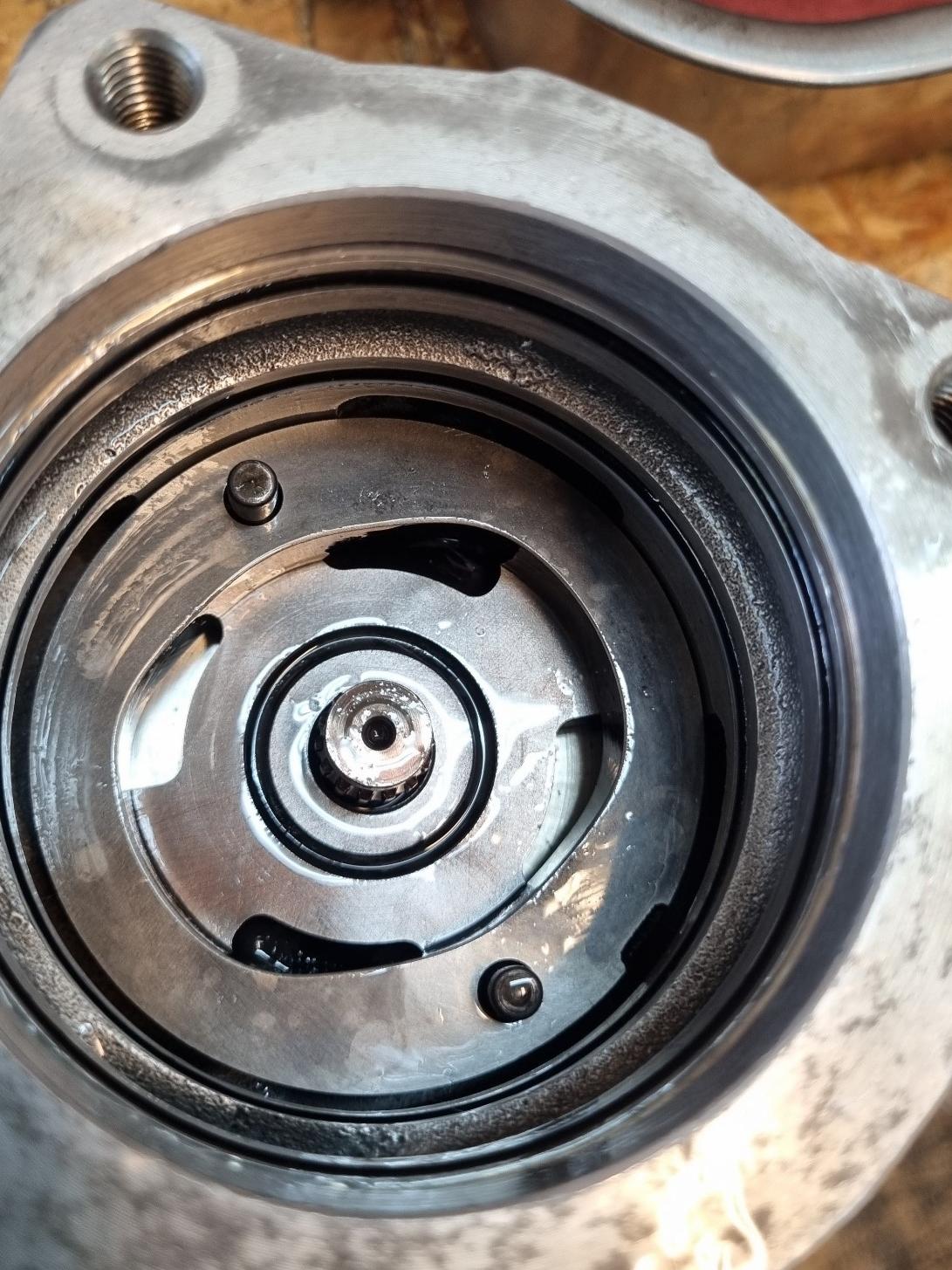 Zwischen Flügelzellenrad und Pumpenwelle sitzt ein kleiner Sicherungsring in einer Nut und arretiert das Rad auf der Welle. Dieser muss äußerst vorsichtig mit einer Sprengringzange auseinander gedrückt und mit einem kleinen Schlitzschraubendreher von hinten aus der Nut gehebelt werden. Es gibt hierfür keine besondere Zange, der Ring ist so gefertigt, dass er in der Nut bündig mit der Druckkammerscheibe und dem Flügelzellenrad abschließt (deshalb hat er auch keine Löcher wie sie Segeringe sonst haben).