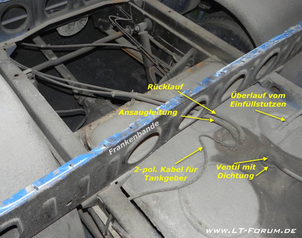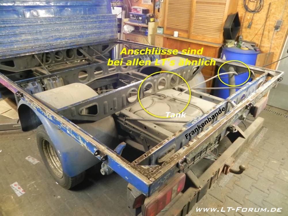 Schön verdeckt ist er, der Kraftstofftank. Aber hier, an diesem Doka-LT (LT-Doppelkabine, mit möglichen 6 Sitzplätzen) mit entfernter Ladefläche, sieht man den Tank mit seinen Anschlüssen in seiner Gesamtheit. Position des Tanks und der Anschlüsse sind bei allen LT ähnlich.