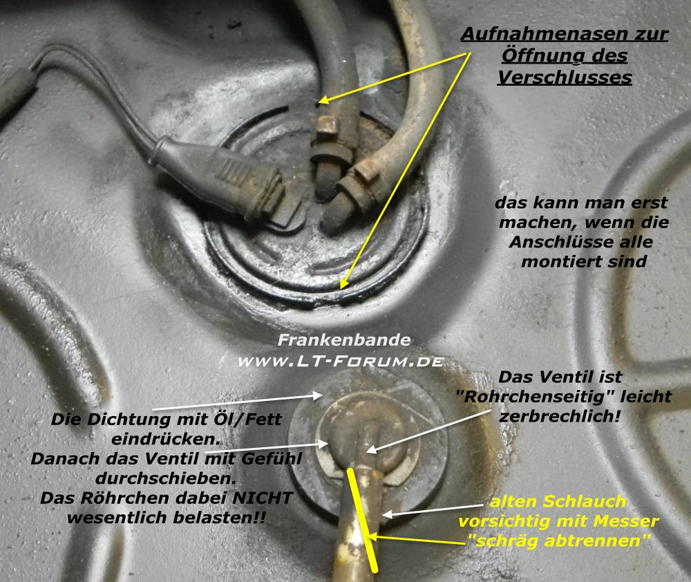 -da der Tankverschluss absolut abdichtet, ist beim LT auf dem Tank ein Entlüftungsventil mit Leitung und einer „Gummitülle“ verbaut.