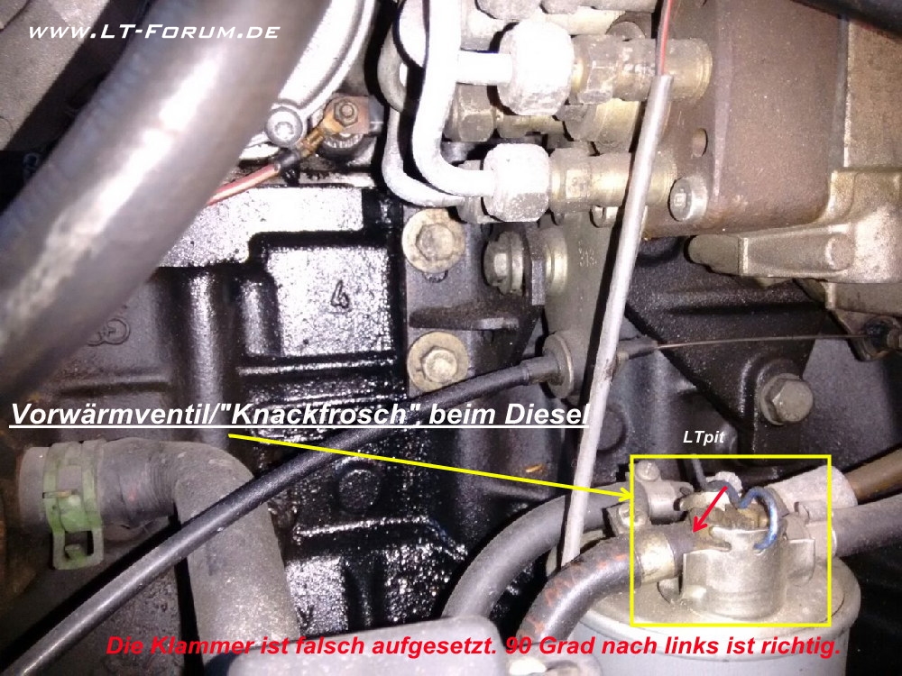 Ursache für das Luftproblem (aufgezeigt durch schlechtem Motorlauf) liegen u. a. auch in dem Vorwärmventil, das auf dem Kraftstofffilter sitzt. Das weiße Teil mit der blauen Halteklammer auf dem Filter. Man nennt es auch Knackfrosch.