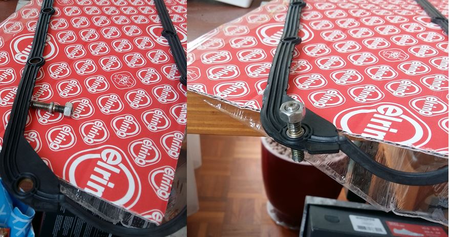 Es werden die gleichen Stehbolzen mit Bund verwendet. Diese Gummimetalldichtung hat ein Blech eingearbeitet, das beim Einbau oben auf dem Bund aufliegt. Der Gummi ist aber so angespritzt, dass die Dichtung an sich über den Bund drüberragt und trotzdem dichtet(bei einem planen Ventildeckel)..