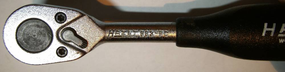 Es ist eine Umschaltknarre, etwa auf 20 Grad abgewinkelt, Vierkant , feinverzahnt(20 Zähne), 115 mm lang(ca. 33 €) und wird mit Schraubendreher-Einsatz(Bit 3mm) HAZET 8501-3 (ca. 4,50 €) bestückt.