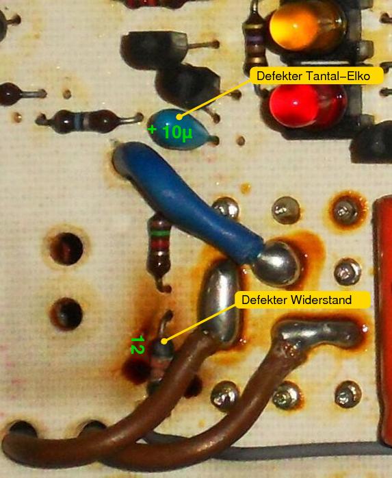 - Durchgebrannter Widerstand in der Timerschaltung aufgrund eines (wegen mangelhafter Schaltfestigkeit) defekten Tantal-Elkos: