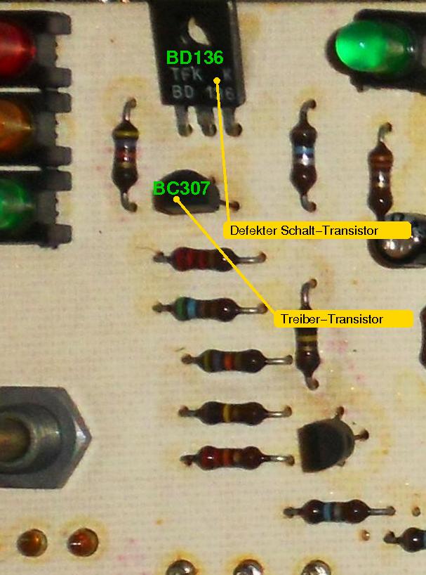 - Durchgebrannter Schalttransistor BD136 in der Timerschaltung aufgrund von Verpolung: