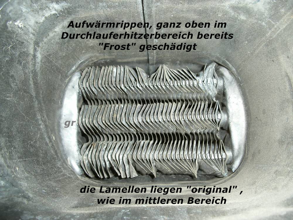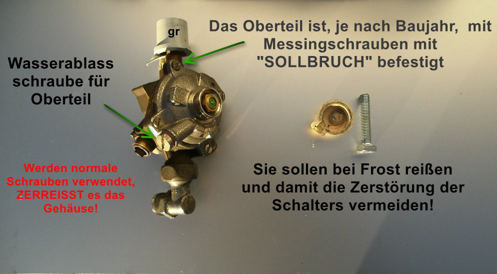 Frostschäden zeigen sich im Durchlauferhitzer mit geplatzten Wasserleitungen im Warmwasserbereich , einer gerissene Gummimembran, abgescherte Messingschrauben im Wasserregelteil. Es sind „Scherschrauben“, die ab einer bestimmten Belastung einfach unter dem Schraubenkopf abbrechen.
