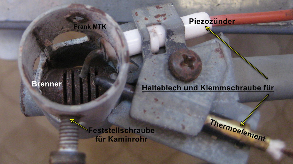 Flammteil im Brenner ist hier mit einer Schraube und einem Metallplättchen in seiner Position fixiert.