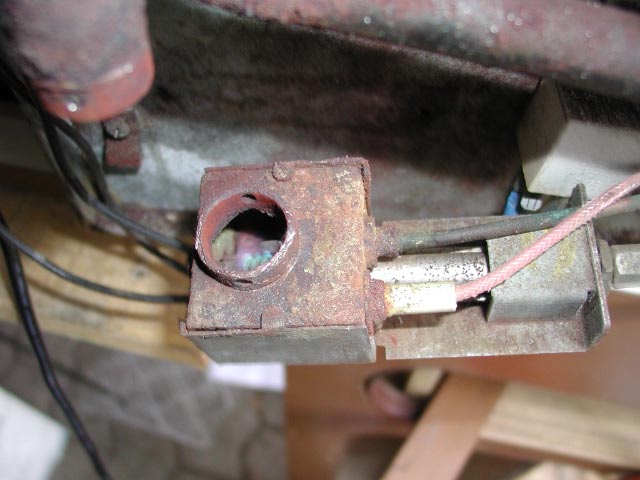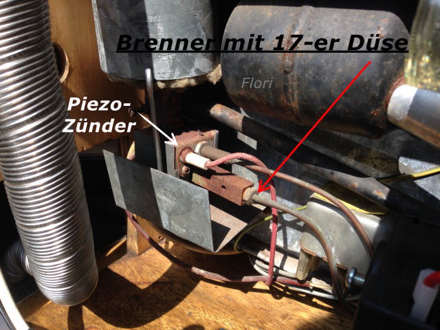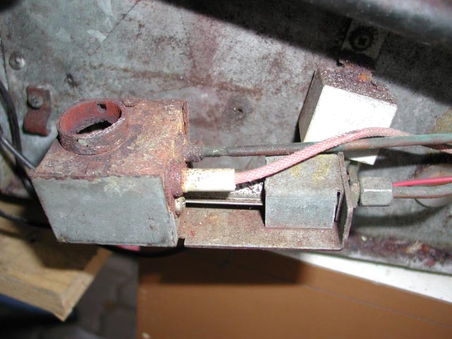 Brenner und das Trennrelais(rechts; hier ist auch hinter der Leitung des Piezozündkabels der total verrostete Anschluß des Thermosicherungselementes zu sehen