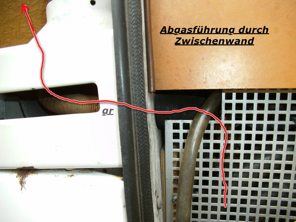 Die im Abgasrohr befindliche „Aluspirale“ ist ganz wichtig! Sie drosselt den Abgasauslass in ganz bestimmter Form und ist vom Hersteller auf eine bestimmte „Einbauhöhe“ fixiert!! NICHT ENTFERNEN!!