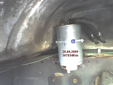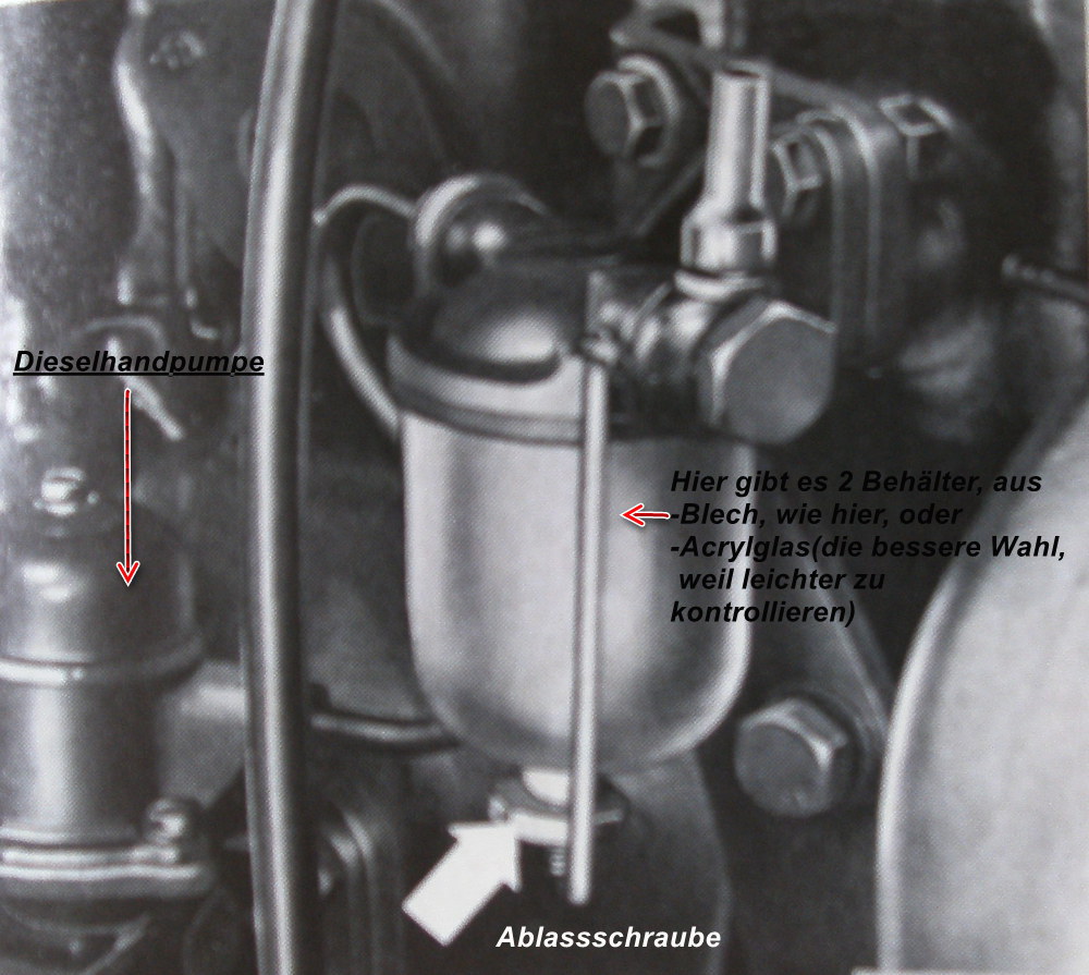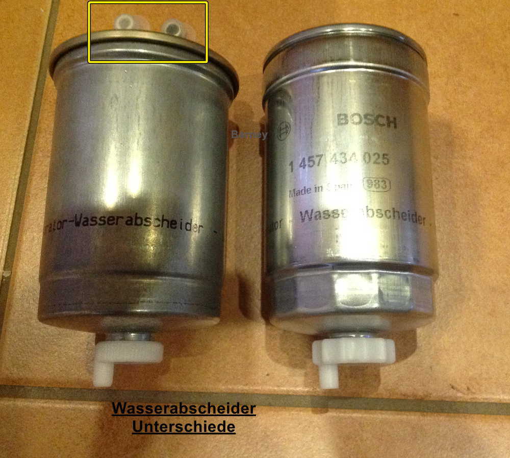 Wobei ergänzend WICHTIG zu sagen ist, der WASSERABSCHEIDER im linken Radhaus ist KEIN FILTER und sollte nicht gegen einen solchen ersetzt werden. Ersatz durch einen Filter sorgt nur für höheren Saugwiderstand der Einspritzpumpe und kann im Extremfall zu Leistungsverlust und/oder Luftansauggung der Einspritzpumpe an deren Wellendichtring führen. Speziell im Winter sorgt ein Filter anstelle des Wasserabscheiders eher für mangelnden Durchfluss durch Versulzen des Kraftstoffs (sofern kein Winter oder ggf. Arctic-Diesel getankt wurde). Falls es unterwegs Probleme mit dem Wasserabscheider gibt und kein Ersatz zu finden ist, einfach die beiden Enden der Kraftstoffrohre im Radkasten mit einem Stück Kraftstoffschlauch knickfrei verbinden.