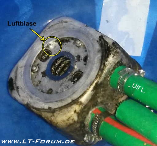 Auf „11:00 Uhr“„ sieht man bei genauem hinschauen, wie sich eine Luftblase bildet. Das Abdrücken erfordert ein bißchen Geduld. Deshalb die Wasserseite erst komplett leeren; sonst muss evtl. erst das Restwasser durch das Loch, bevor Luft aufsteigt.(Auszugsweise aus Forumsbeitrag von Ulf L. 22.03.2017 00:26 ) .